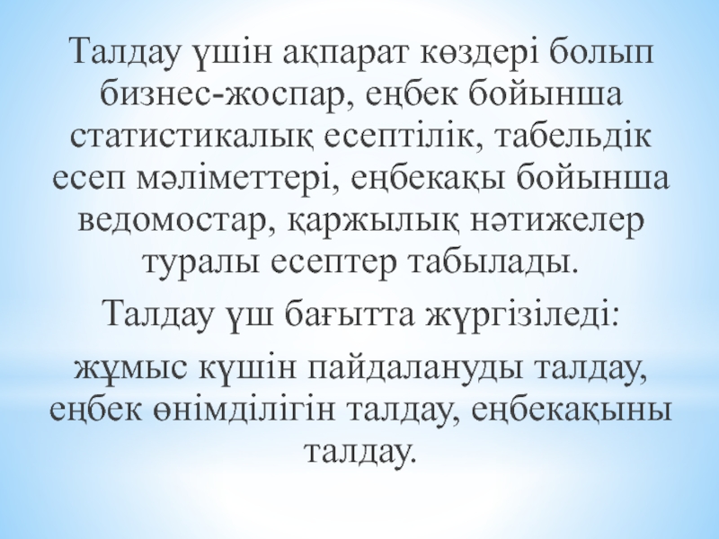 Слайд 3Талдау үшін ақпарат көздері болып бизнес-жоспар, еңбек бойынша статистикалық есептілік,