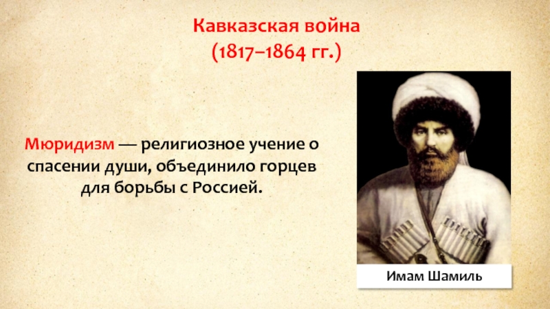 Кавказская война (1817–1864 гг.)Мюридизм — религиозное учение о спасении души, объединило горцев для борьбы с Россией.Имам Шамиль