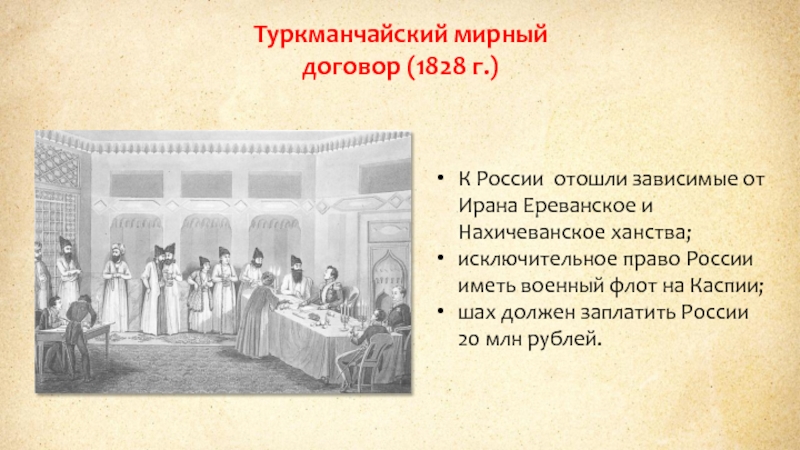 Туркманчайский мирный договор (1828 г.)К России отошли зависимые от Ирана Ереванское и Нахичеванское ханства;исключительное право России иметь