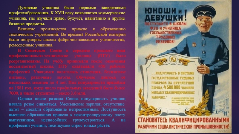 Приём в них проводился путём призыва (мобилизации), а также в порядке добровольного набора молодёжи. У Советского государства появилась возможность планомерно обеспечить народное хозяйство кадрами молодых рабочих. Идея «Государственных Трудовых Резервов» с честью выдержала испытание в годы Великой Отечественной войны. А в послевоенные годы на их плечи легла тяжесть восстановления разрушенного войной хозяйства.