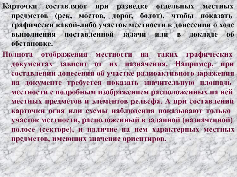 Слайд 19Карточки составляют при разведке отдельных местных предметов (рек, мостов, дорог,