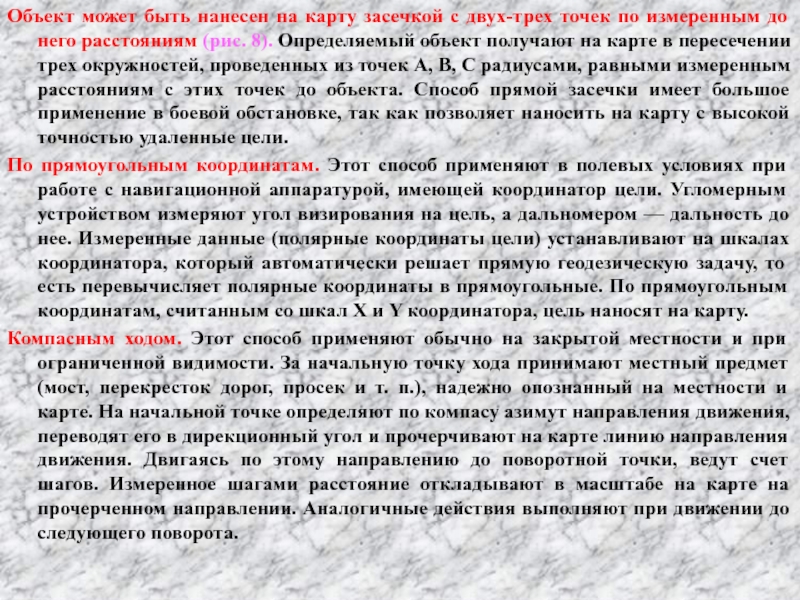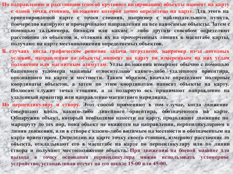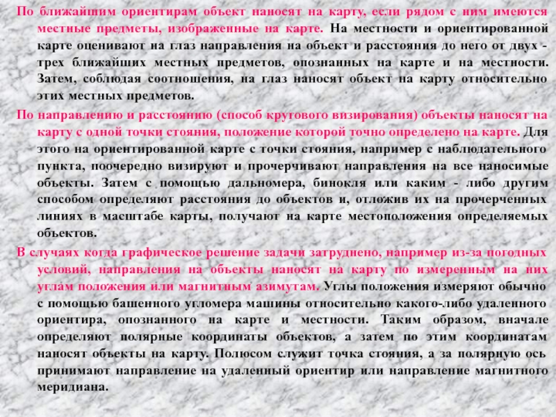 Способы нанесения на карту объектов. При подготовке и в ходе боевых действий, при составлении боевых графических документов и в других случаях возникает необходимость нанесения на карту (схему) элементов боевых порядков, целей, ориентиров и других не обозначенных на ней объектов. Такие объекты наносят на карту в полевых условиях следующими способами: по ближайшим ориентирам на глаз, по направлению и расстоянию до объекта, по полярным координатам, по перпендикуляру и створу, прямой засечкой, по прямоугольным координатам, компасным ходом.