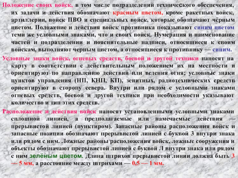 войск ПВО и специальных войск, которые обозначают чёрным цветом. Положение и действия войск противника показывают синим цветом теми же условными знаками, что и своих войск. Нумерация и наименование частей и подразделении и пояснительные надписи, относящиеся к своим войскам, выполняют черным цветом, а относящиеся к противнику — синим.