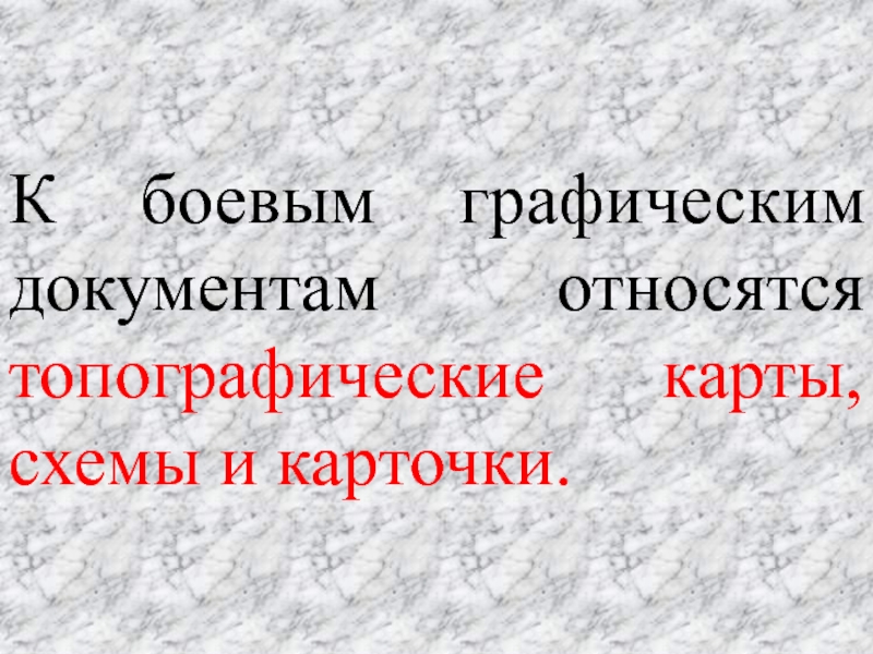 Слайд 8К боевым графическим документам относятся топографические карты, схемы и карточки.