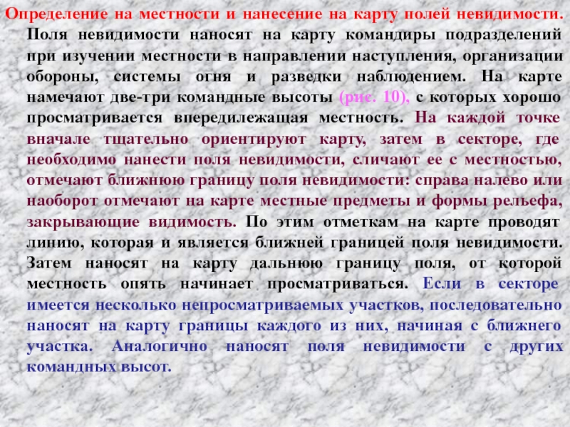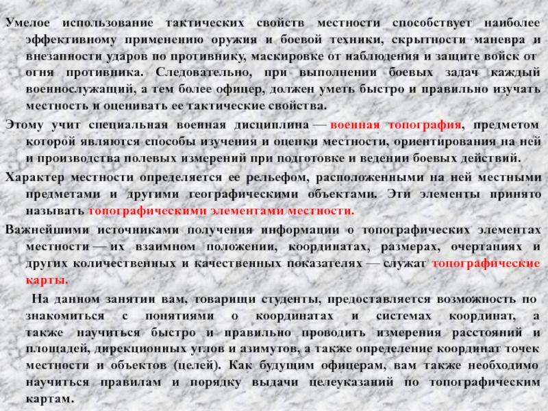 маскировке от наблюдения и защите войск от огня противника. Следовательно, при выполнении боевых задач каждый военнослужащий, а тем более офицер, должен уметь быстро и правильно изучать местность и оценивать ее тактические свойства.