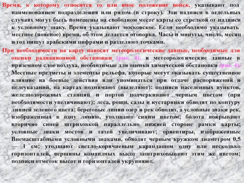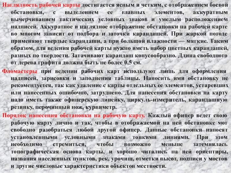 Порядок нанесения обстановки на рабочую карту. Каждый офицер ведет свою рабочую карту лично и так, чтобы в отображаемой на ней обстановке мог свободно разобраться любой другой офицер. Данные обстановки наносят установленными условными знаками тонкими линиями. При этом необходимо стремиться, чтобы возможно меньше затемнялась топографическая основа карты и хорошо читались на ней ориентиры, названия населенных пунктов, рек, урочищ, отметки высот, подписи у мостов и другие числовые характеристики объектов местности.