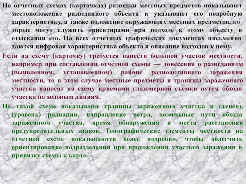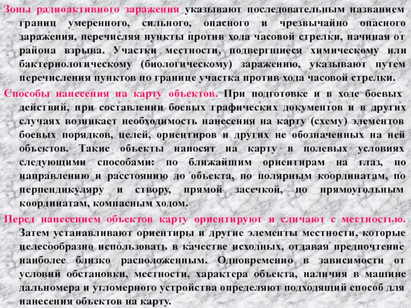 начиная от района взрыва. Участки местности, подвергшиеся химическому или бактериологическому (биологическому) заражению, указывают путем перечисления пунктов по границе участка против хода часовой стрелки.