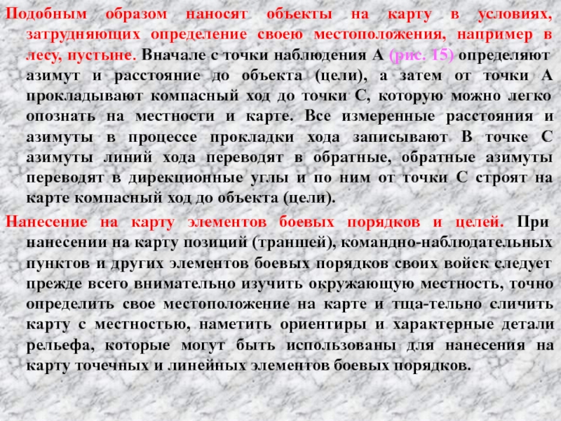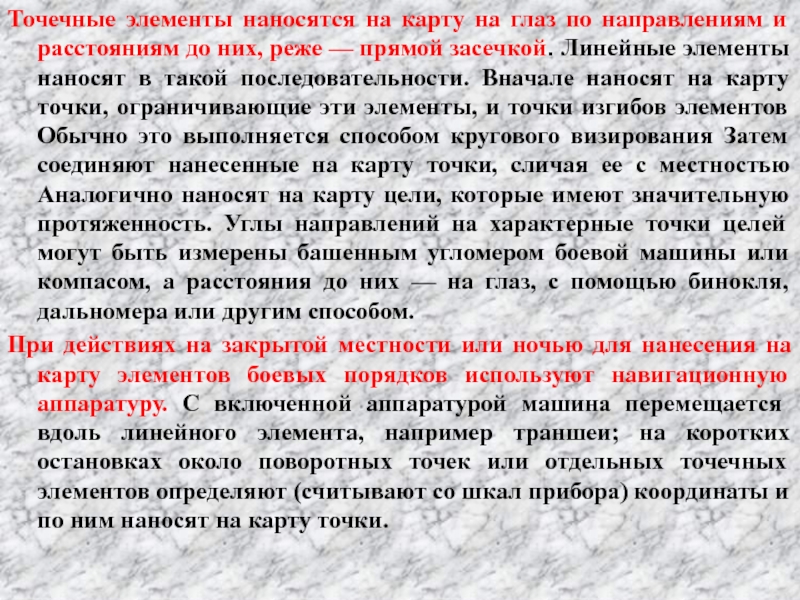 Нанесение на карту элементов боевых порядков и целей. При нанесении на карту позиций (траншей), командно-наблюдательных пунктов и других элементов боевых порядков своих войск следует прежде всего внимательно изучить окружающую местность, точно определить свое местоположение на карте и тща-тельно сличить карту с местностью, наметить ориентиры и характерные детали рельефа, которые могут быть использованы для нанесения на карту точечных и линейных элементов боевых порядков.