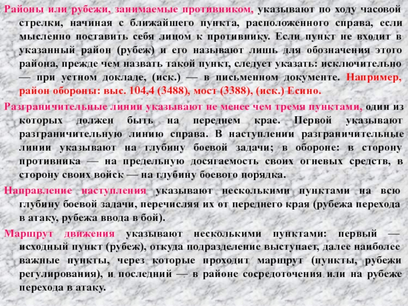 лицом к противнику. Если пункт не входит в указанный район (рубеж) и его называют лишь для обозначения этого района, прежде чем назвать такой пункт, следует указать: исключительно — при устном докладе, (иск.) — в письменном документе. Например, район обороны: выс. 104,4 (3488), мост (3388), (иск.) Есино.