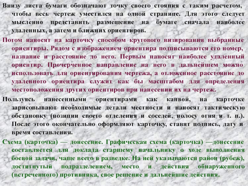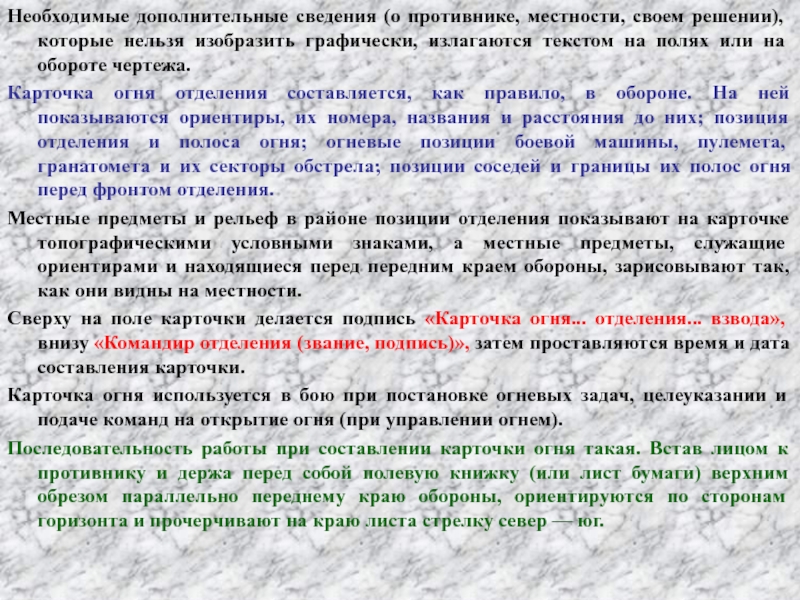 Пользуясь нанесенными ориентирами как канвой, на карточке зарисовывают необходимые детали местности и наносят тактическую обстановку (позиции своего отделения и соседей, полосу огня и т. п.). После этого окончательно оформляют карточку, ставят подпись, дату и время составления.