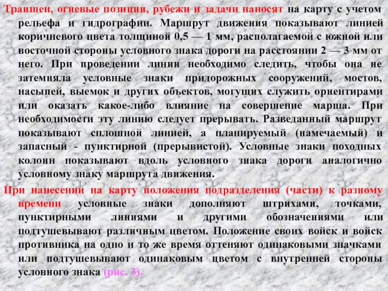 Траншеи, огневые позиции, рубежи и задачи наносят на карту с учетом рельефа и гидрографии. Маршрут движения показывают линией коричневого цвета толщиной 0,5 — 1 мм, располагаемой с южной или восточной стороны условного знака дороги на расстоянии 2 — 3 мм от него. При проведении линии необходимо следить, чтобы она не затемняла условные знаки придорожных сооружений, мостов, насыпей, выемок и других объектов, могущих служить ориентирами или оказать какое-либо влияние на совершение марша. При необходимости эту линию следует прерывать Разведанный маршрут показывают сплошной линией, а планируемый (намечаемый) и запасный — пунктирной (прерывистой).