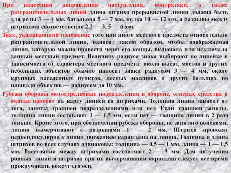 того, заняты траншеи подразделениями или нет. Если траншеи заняты, толщина линии составляет 1 — 1,5 мм, если нет — толщина линии в 2 раза тоньше. Кроме этого, при обозначении рубежа обороны, не занятого войсками, линию вычерчивают с разрывами 1 — 2 мм. Штрихи проводят перпендикулярно к линии движением карандаша на линию. Толщина и длина штрихов во всех случаях одинаковы: толщина — 0,5 — 1 мм, длина — 1 — 1,5 мм. Расстояния между штрихами составляют 2 — 3 мм. Для получения ровных линий и штрихов при их вычерчивании карандаш следует все время прокручивать вокруг его оси.