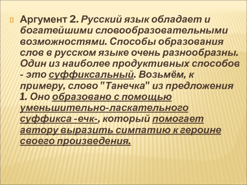 Слайд 15Аргумент 2. Русский язык обладает и богатейшими словообразовательными возможностями. Способы