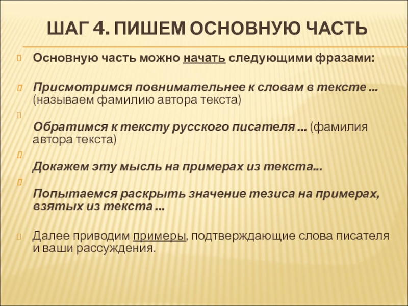 Далее приводим примеры, подтверждающие слова писателя и ваши рассуждения.