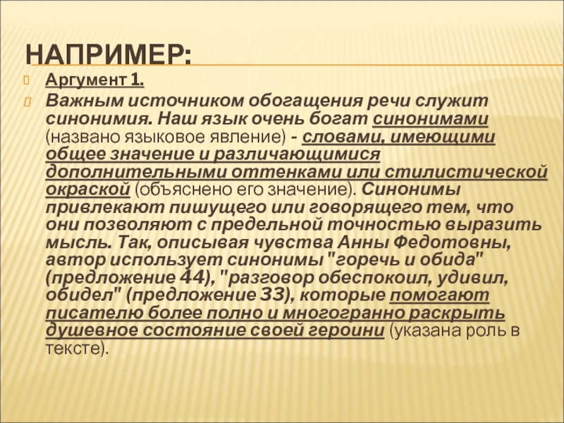 различающимися дополнительными оттенками или стилистической окраской (объяснено его значение). Синонимы привлекают пишущего или говорящего тем, что они позволяют с предельной точностью выразить мысль. Так, описывая чувства Анны Федотовны, автор использует синонимы "горечь и обида" (предложение 44), "разговор обеспокоил, удивил, обидел" (предложение 33), которые помогают писателю более полно и многогранно раскрыть душевное состояние своей героини (указана роль в тексте).