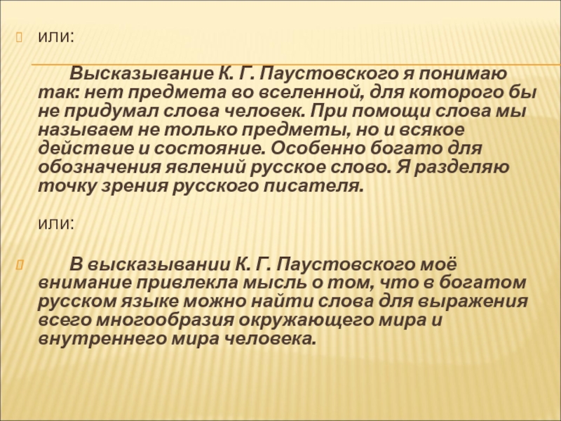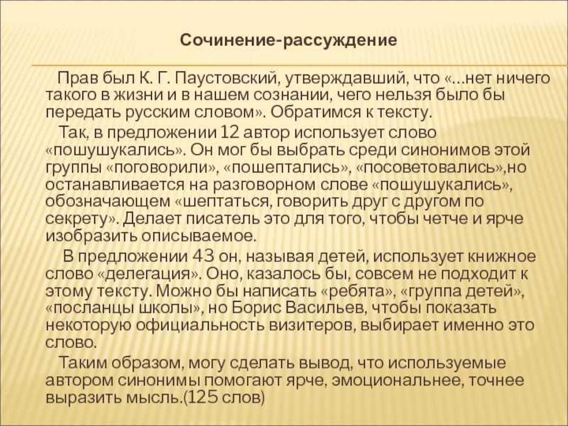 Таким образом, могу сделать вывод, что прав был К. Г. Паустовский, утверждавший, что «…нет ничего такого в жизни и в нашем сознании, чего нельзя было бы передать русским словом».(126 слов)