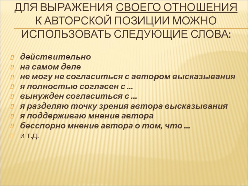 Слайд 8Для выражения своего отношения к авторской позиции можно использовать следующие