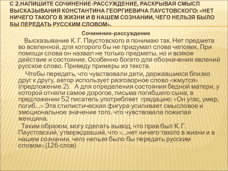 Слайд 19С 2.Напишите сочинение-рассуждение, раскрывая смысл высказывания Константина Георгиевича Паустовского: «Нет