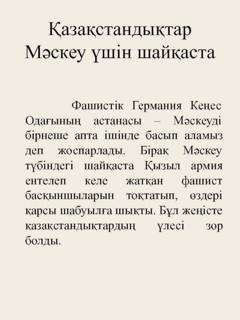 Бірақ Мәскеу түбіндегі шайқаста Қызыл армия ентелеп келе жатқан фашист басқыншыларын тоқтатып, өздері қарсы шабуылға шықты. Бұл жеңісте қазақстандықтардың үлесі зор болды.
