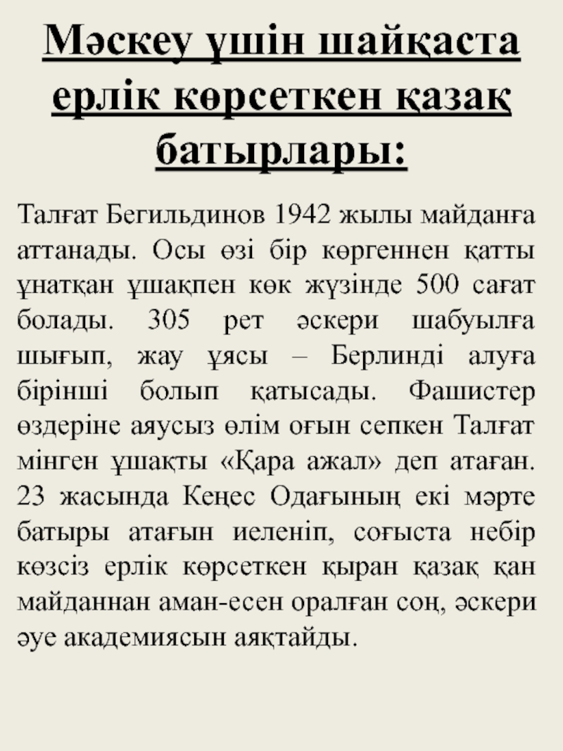 Слайд 14Мәскеу үшін шайқаста ерлік көрсеткен қазақ батырлары: