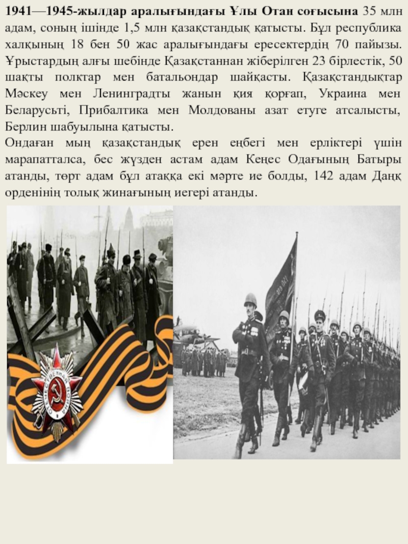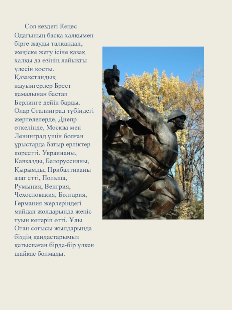қосты. Қазақстандық жауынгерлер Брест қамалынан бастап Берлинге дейін барды. Олар Сталинград түбіндегі жертөлелерде, Днепр өткелінде, Москва мен Ленинград үшін болған ұрыстарда батыр ерліктер көрсетті. Украинаны, Кавказды, Белоруссияны, Қырымды, Прибалтиканы азат етті, Польша, Румыния, Венгрия, Чехословакия, Болгария, Германия жерлеріндегі майдан жолдарында жеңіс туын көтеріп өтті. Ұлы Отан соғысы жылдарында біздің қандастарымыз қатыспаған бірде-бір үлкен шайқас болмады.