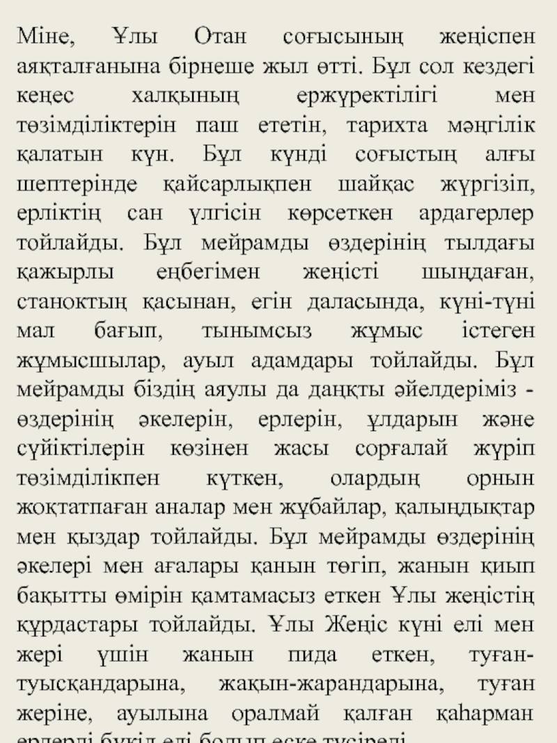 мәңгілік қалатын күн. Бұл күнді соғыстың алғы шептерінде қайсарлықпен шайқас жүргізіп, ерліктің сан үлгісін көрсеткен ардагерлер тойлайды. Бұл мейрамды өздерінің тылдағы қажырлы еңбегімен жеңісті шыңдаған, станоктың қасынан, егін даласында, күні-түні мал бағып, тынымсыз жұмыс істеген жұмысшылар, ауыл адамдары тойлайды. Бұл мейрамды біздің аяулы да даңқты әйелдеріміз - өздерінің әкелерін, ерлерін, ұлдарын және сүйіктілерін көзінен жасы сорғалай жүріп төзімділікпен күткен, олардың орнын жоқтатпаған аналар мен жұбайлар, қалыңдықтар мен қыздар тойлайды. Бұл мейрамды өздерінің әкелері мен ағалары қанын төгіп, жанын қиып бақытты өмірін қамтамасыз еткен Ұлы жеңістің құрдастары тойлайды. Ұлы Жеңіс күні елі мен жері үшін жанын пида еткен, туған-туысқандарына, жақын-жарандарына, туған жеріне, ауылына оралмай қалған қаһарман ерлерді бүкіл елі болып еске түсіреді.