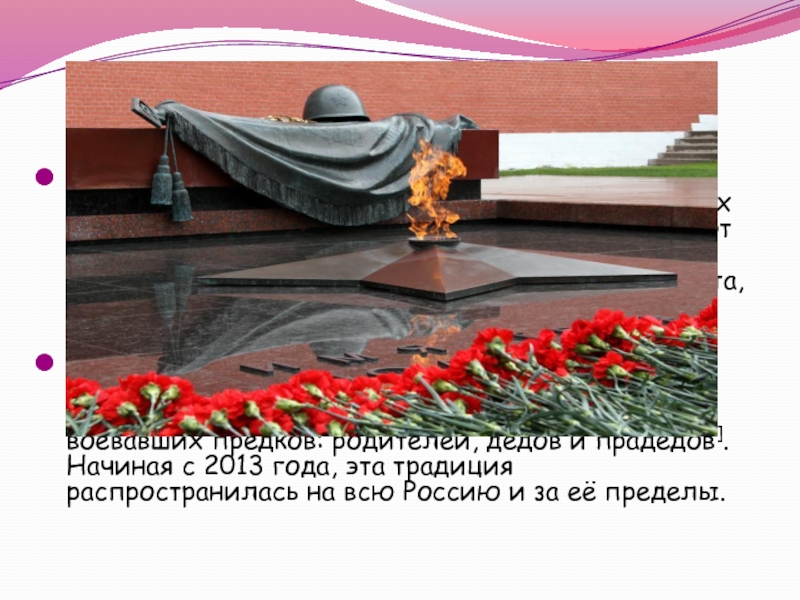 В День Победы производится организованное шествие к Могиле Неизвестного Солдата(в Москве), парад в городах-героях, праздничный салют.