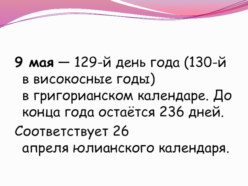 Слайд 29 мая — 129-й день года (130-й в високосные годы) в григорианском календаре. До конца года