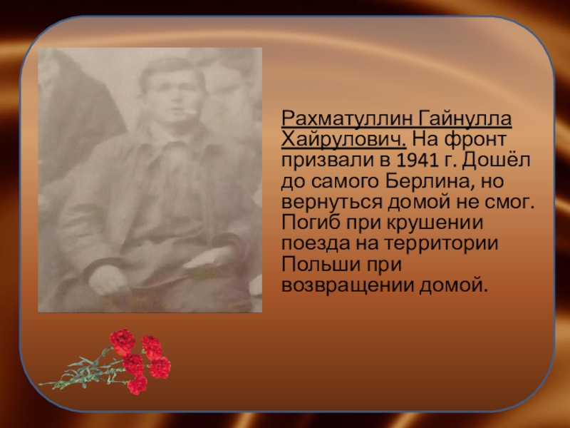 Слайд 8Рахматуллин Гайнулла Хайрулович. На фронт призвали в 1941 г. Дошёл