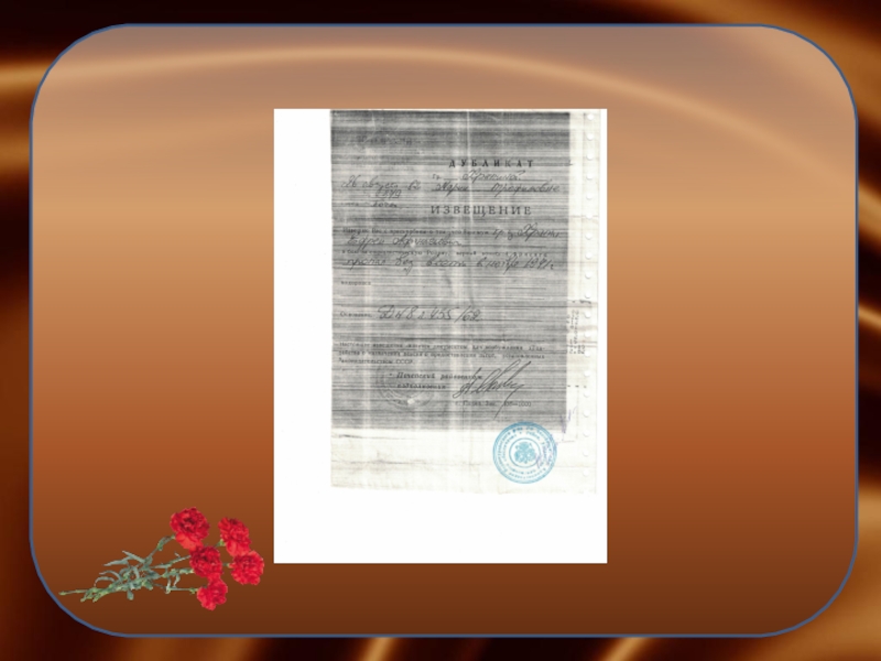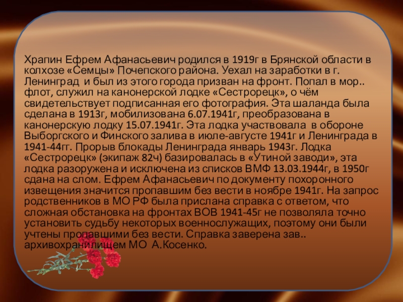 и был из этого города призван на фронт. Попал в мор..флот, служил на канонерской лодке «Сестрорецк», о чём свидетельствует подписанная его фотография. Эта шаланда была сделана в 1913г, мобилизована 6.07.1941г, преобразована в канонерскую лодку 15.07.1941г. Эта лодка участвовала в обороне Выборгского и Финского залива в июле-августе 1941г и Ленинграда в 1941-44гг. Прорыв блокады Ленинграда январь 1943г. Лодка «Сестрорецк» (экипаж 82ч) базировалась в «Утиной заводи», эта лодка разоружена и исключена из списков ВМФ 13.03.1944г, в 1950г сдана на слом. Ефрем Афанасьевич по документу похоронного извещения значится пропавшим без вести в ноябре 1941г. На запрос родственников в МО РФ была прислана справка с ответом, что сложная обстановка на фронтах ВОВ 1941-45г не позволяла точно установить судьбу некоторых военнослужащих, поэтому они были учтены пропавшими без вести. Справка заверена зав..архивохранилищем МО А.Косенко.
