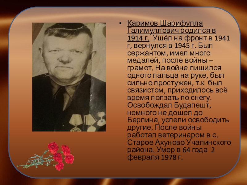 Слайд 5Каримов Шарифулла Галимуллович родился в 1914 г. Ушёл на фронт