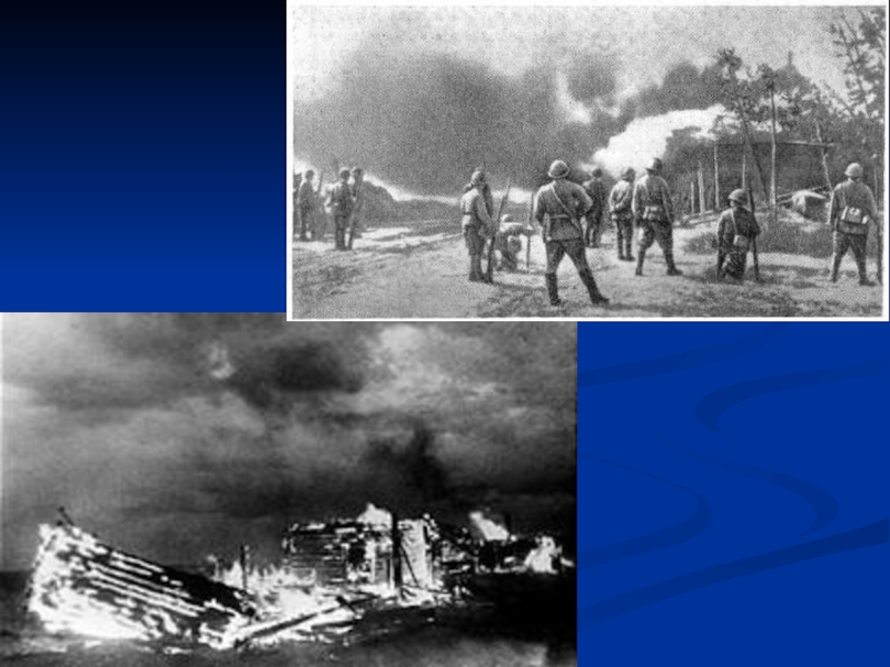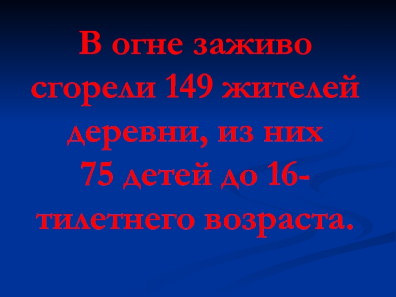 Слайд 5 В огне заживо сгорели 149 жителей деревни, из них 75 детей до 16-тилетнего возраста.