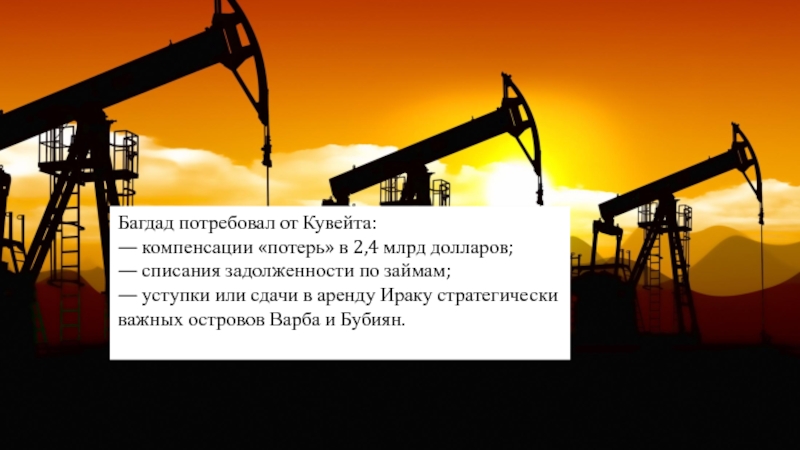Багдад потребовал от Кувейта: — компенсации «потерь» в 2,4 млрд долларов;— списания задолженности по займам;— уступки или