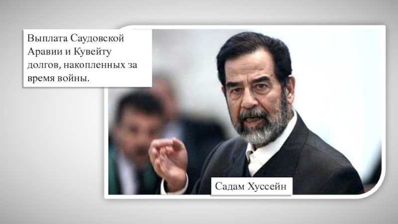 Садам ХуссейнВыплата Саудовской Аравии и Кувейту долгов, накопленных за время войны.