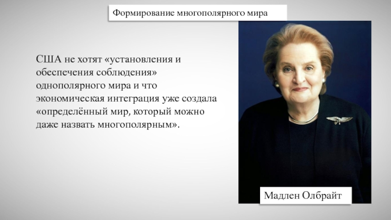 Формирование многополярного мираМадлен ОлбрайтСША не хотят «установления и обеспечения соблюдения» однополярного мира и что экономическая интеграция уже