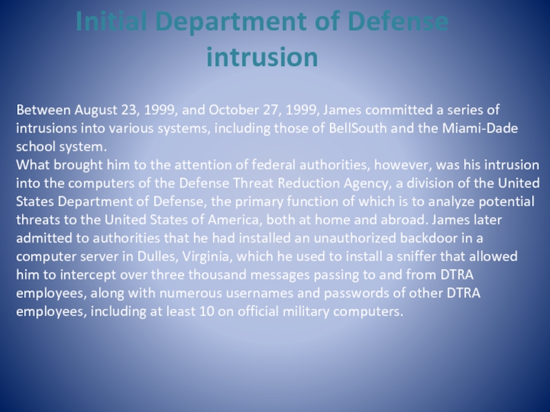 What brought him to the attention of federal authorities, however, was his intrusion into the computers of the Defense Threat Reduction Agency, a division of the United States Department of Defense, the primary function of which is to analyze potential threats to the United States of America, both at home and abroad. James later admitted to authorities that he had installed an unauthorized backdoor in a computer server in Dulles, Virginia, which he used to install a sniffer that allowed him to intercept over three thousand messages passing to and from DTRA employees, along with numerous usernames and passwords of other DTRA employees, including at least 10 on official military computers.