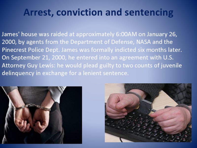 Defense, NASA and the Pinecrest Police Dept. James was formally indicted six months later. On September 21, 2000, he entered into an agreement with U.S. Attorney Guy Lewis: he would plead guilty to two counts of juvenile delinquency in exchange for a lenient sentence.