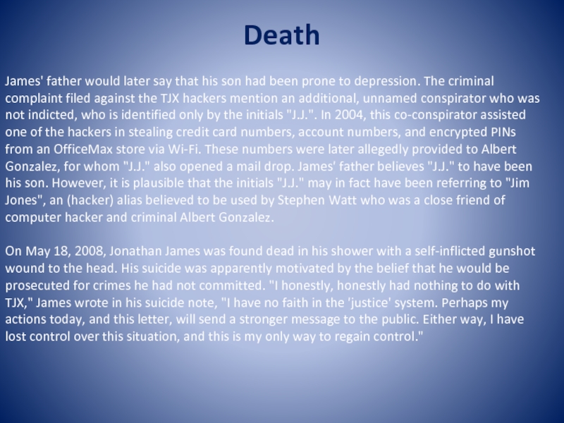 On May 18, 2008, Jonathan James was found dead in his shower with a self-inflicted gunshot wound to the head. His suicide was apparently motivated by the belief that he would be prosecuted for crimes he had not committed. "I honestly, honestly had nothing to do with TJX," James wrote in his suicide note, "I have no faith in the 'justice' system. Perhaps my actions today, and this letter, will send a stronger message to the public. Either way, I have lost control over this situation, and this is my only way to regain control."