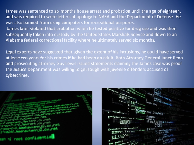 Legal experts have suggested that, given the extent of his intrusions, he could have served at least ten years for his crimes if he had been an adult. Both Attorney General Janet Reno and prosecuting attorney Guy Lewis issued statements claiming the James case was proof the Justice Department was willing to get tough with juvenile offenders accused of cybercrime.