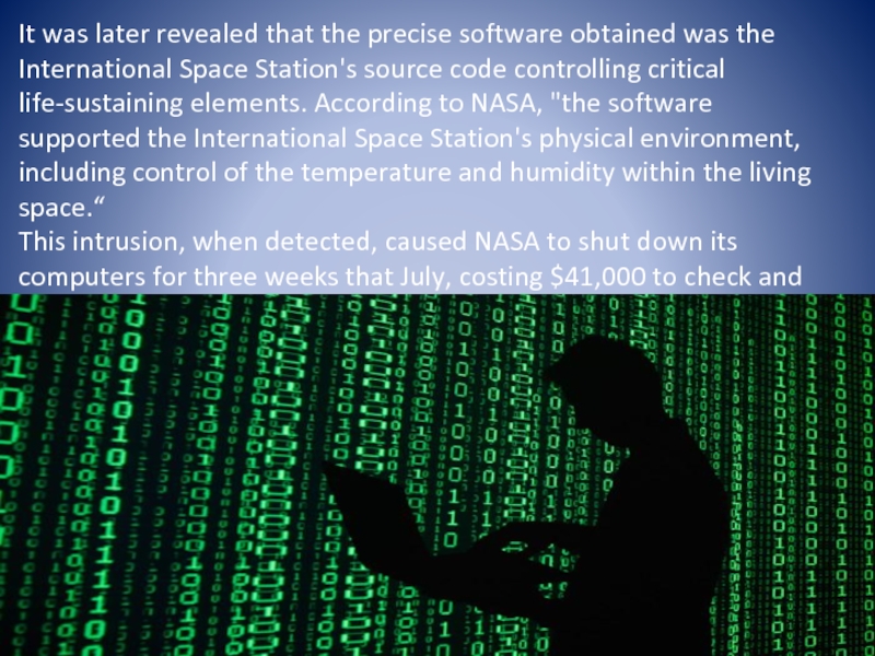 This intrusion, when detected, caused NASA to shut down its computers for three weeks that July, costing $41,000 to check and fix it`s systems.
