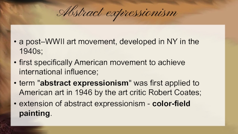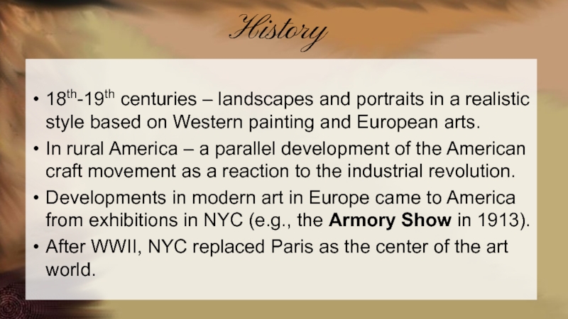 – a parallel development of the American craft movement as a reaction to the industrial revolution.Developments in modern art in Europe came to America from exhibitions in NYC (e.g., the Armory Show in 1913).