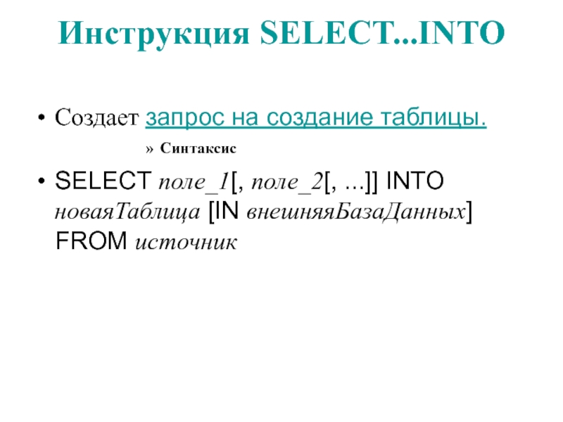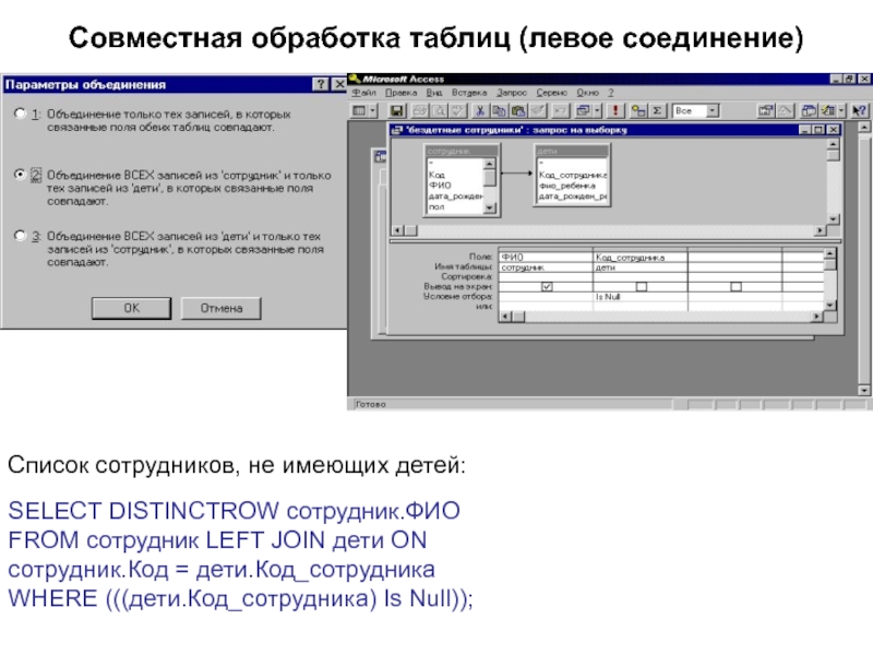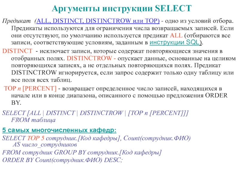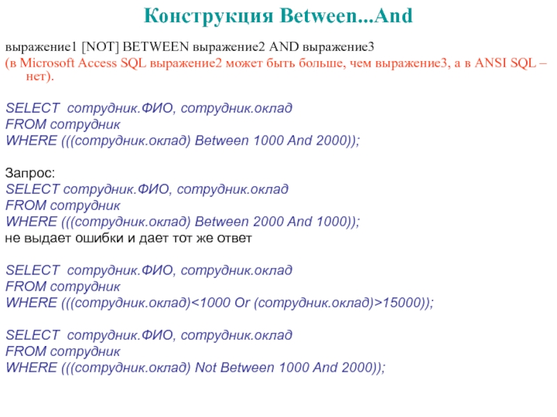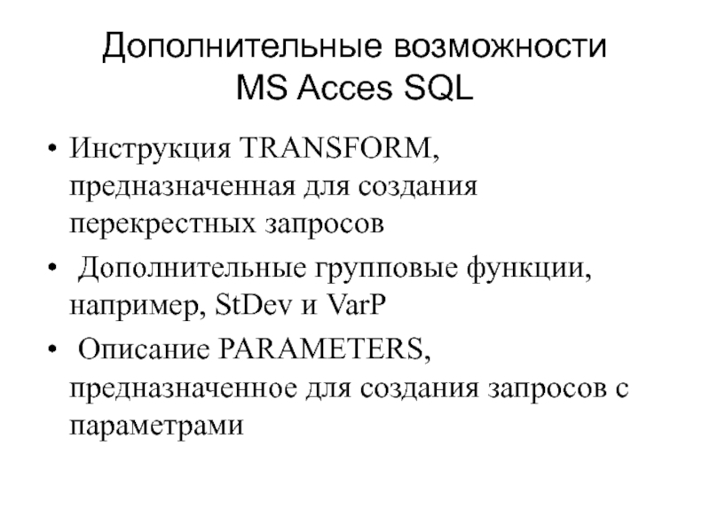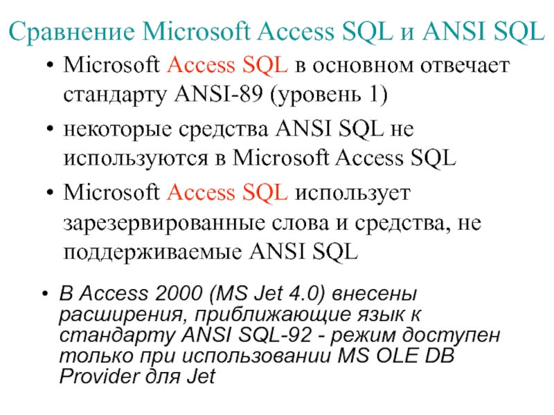 используются в Microsoft Access SQL Microsoft Access SQL использует зарезервированные слова и средства, не поддерживаемые ANSI SQL