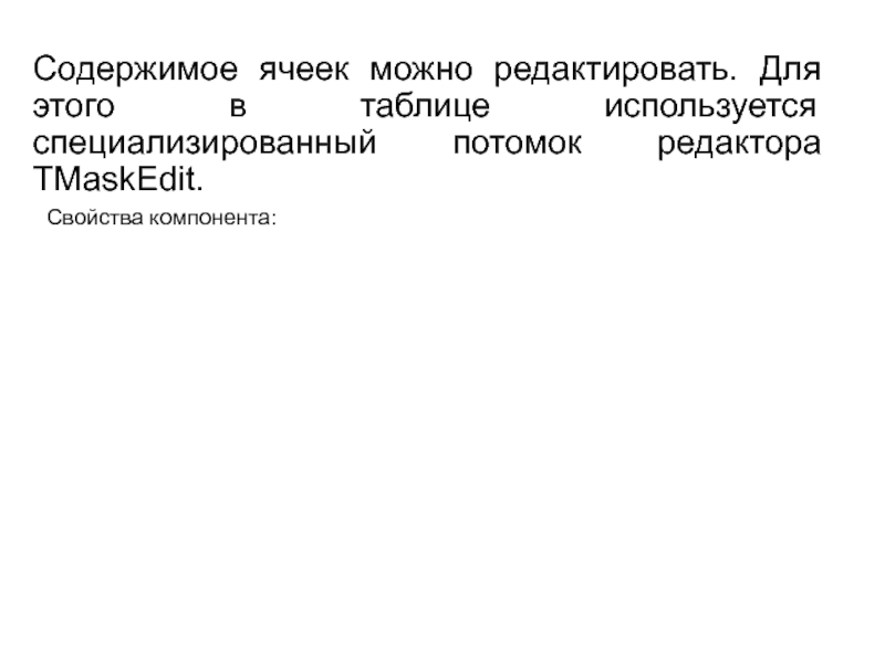 Слайд 2Компонент TStringGrid предназначен для создания таблиц, в ячейках которых располагаются