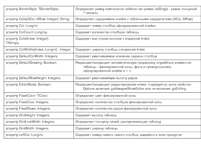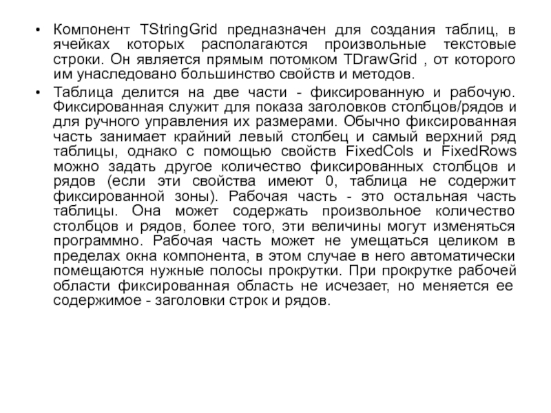 произвольные текстовые строки. Он является прямым потомком TDrawGrid , от