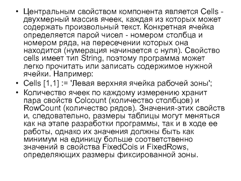 Слайд 3Центральным свойством компонента является Cells - двухмерный массив ячеек, каждая