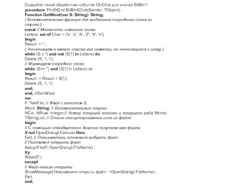 Слайд 10Создайте такой обработчик события OnClick для кнопки BitBtn1: