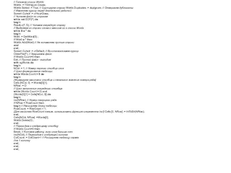 NCol, NRow: Integer;// Номер текущей колонки и текущего ряда Words: TStringList; // Список отсортированных слов из файла