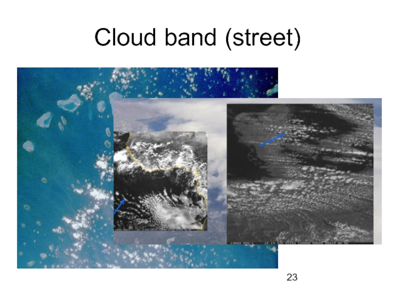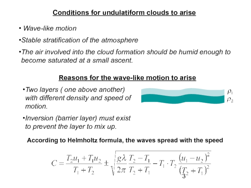 The undulatiform clouds are seen as long banks, bands, streets, and plates. The sizes of these formations are: 10³-10² km in horizontal directions, and 101-10² meters in vertical, rarely up to 2 km.