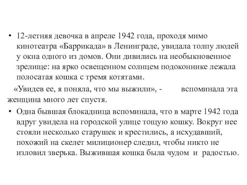 Одна бывшая блокадница вспоминала, что в марте 1942 года вдруг увидела на городской улице тощую кошку. Вокруг нее стояли несколько старушек и крестились, а исхудавший, похожий на скелет милиционер следил, чтобы никто не изловил зверька. Выжившая кошка была чудом и радостью.