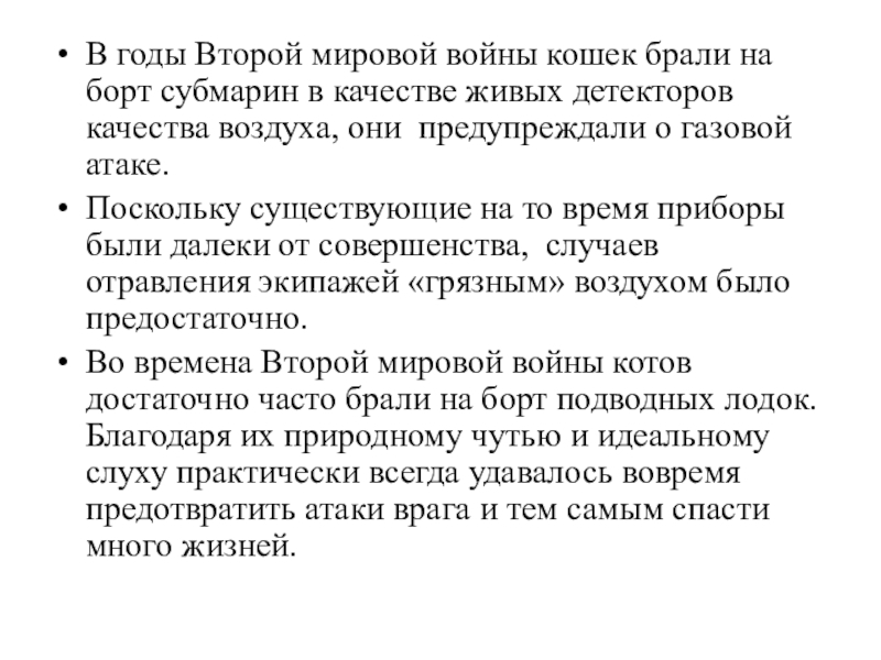 Слайд 7В годы Второй мировой войны кошек брали на борт субмарин